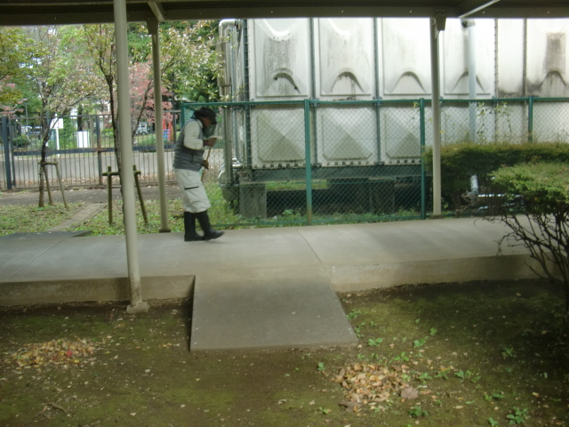 渡り廊下では、用務員さんが落ち葉を集めてきれいに掃除してくれています。