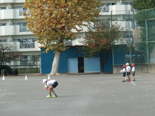 校庭では3年生がボール蹴り運動をしています。サッカーかなと思っていると…