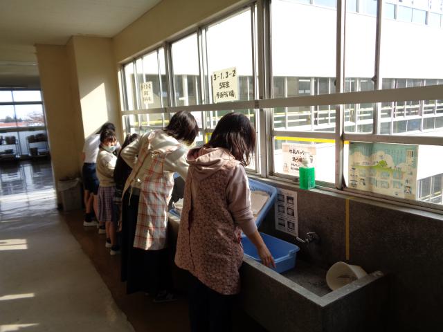 子どもたちが開いた牛乳パックを先生方が洗っています。