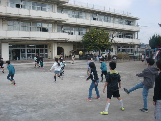 今日も暖かい一日でした。校庭の体育では、2年生と6年生が仲良く体育していました。