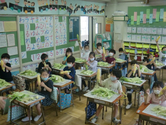 今朝は2年生がとうもろこしの皮むきと枝豆のさやむきに挑戦しました。