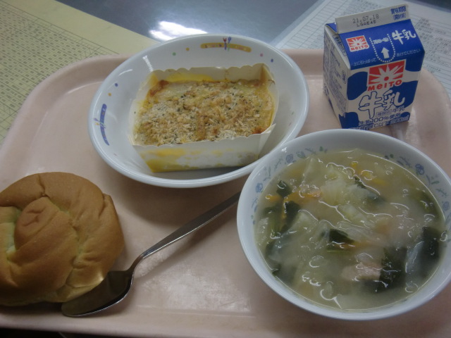 給食もオリンピック給食ということで、ギリシャ料理です。あしたばパンは月桂樹をイメージしたそうです。