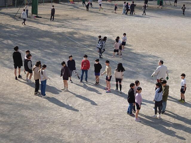 青空の下、3年生がお正月遊びの「羽子板」で楽しそうに遊んでいました。