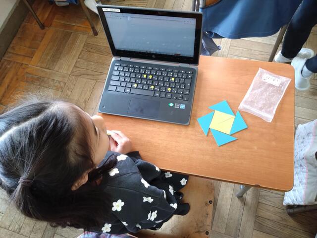 1年生は色板を使って、「かたちあそび」をしていました。お気に入りの作品ができたら、タブレットでしっかり保存していました。