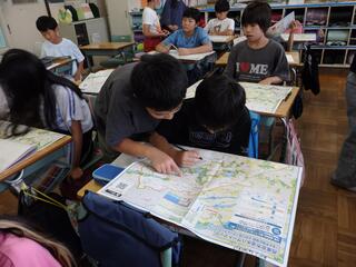4年生の社会科では、ハザードマップを使って、自分の地域の危険なところや避難所について調べていました。