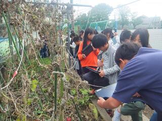4年生では、春過ぎから続けているヘチマの観察をしました。夏と比べて大きく変わったヘチマの様子に子ども達も驚いていました。