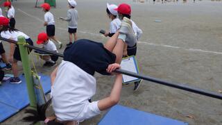 1年生の体育で鉄棒をしています。様々な技に挑戦中!