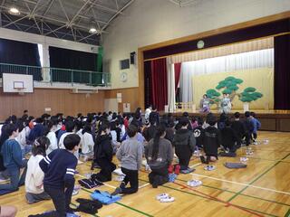体育館で、狂言師の方々による表現の鑑賞と、体験お稽古が行われました。