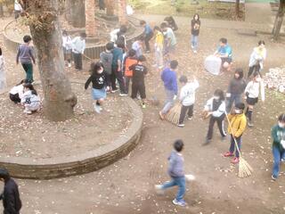 今日の清掃時間は、環境美化活動です。木が多い谷戸二小の落ち葉を、協力して集めました。