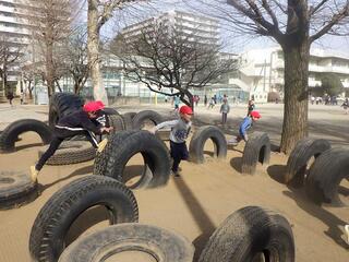校庭のタイヤゾーンには、何個タイヤがあるでしょう?寒さに負けず、元気に遊んでいます。