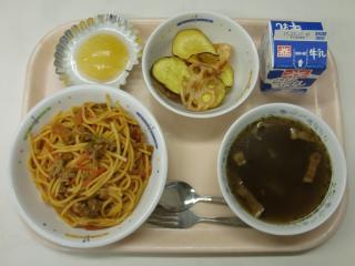 スパゲティナポリタン 野菜チップス オニオンスープ おかしな目玉焼き 牛乳