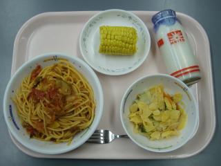 トマトのスパゲティ コーンフレークサラダ ゆでとうもろこし 牛乳