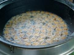 呉汁は、日本各地に伝わる郷土料理の一つです。「呉」とは、大豆を水につけ、やわらかくしてすりつぶしたもので、「呉」をみそ汁に入れたものを呉汁といいます。給食では、水につけてゆでた大豆を、ミキサーでこまかくつぶして入れました。大豆は、肉や魚と同じでたんぱく質を多く含む食べ物です。骨や筋肉、血液などをつくる働きがあるので、体を大きくしていくのに大切です。