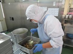 大量調理では照りを出すのが難しいので、とろみをつけた薄だれを上からかけています。