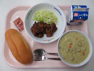 コッペパン・いちごジャム くじらの竜田揚げ せんキャベツ カレーシチュー 牛乳
