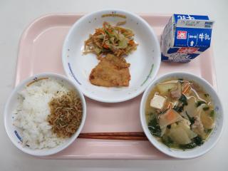 手作りふりかけごはん 鶏肉のレモンしょうゆ焼き カミカミサラダ みそけんちん汁 牛乳