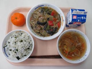 わかめごはん なすのピリ辛みそ炒め 沢煮椀 冷凍みかん 牛乳