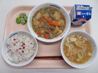 カリカリ梅ごはん じゃがいものそぼろ煮 ゆでそら豆 大根と玉ねぎのみそ汁 牛乳