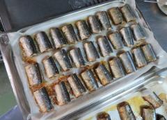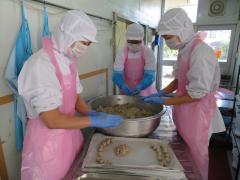 煮魚は給食で作ると味が染み込むまでに時間がかかるので、作るのが難しい料理の一つです。大きな釜で煮て作ることもありますが、今日は焼きと蒸しの機能が付いたオーブンで作りました。深い天板に魚を並べ、とろみをしっかり付けた煮汁を上からたっぷりかけて、クッキングシートで落し蓋をし、蓋をして30分蒸し焼きにします。こうすることで、しっかり煮込んだように味が染みたおいしい煮魚になります。