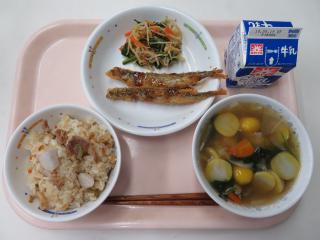 里芋ごはん ししゃものフライ もやしの和え物 お月見汁 牛乳