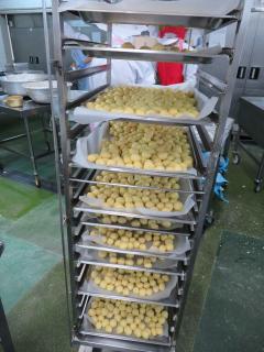 今日のデザートは、「オレンジスフレ」です。クリームチーズとみかんの缶詰を入れています。「スフレ」はフランス語で“ふくらんだ”という意味ですが、その名の通り、焼いている時にはふわふわにふくらんでいました。食べる頃にはしぼんでしまいましたが、ふわふわとろとろした食感は残っていて、「おいしい!」と好評でした。