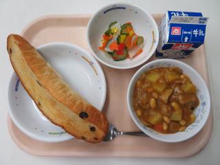 レーズンシュガートースト ピクルス風サラダ カレービーンズ 牛乳