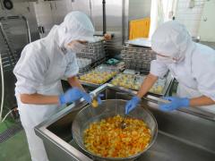 ビビンバは、ごはんの上に、野菜の和え物や味付けした肉、卵などをのせて、ごま油とコチュジャンを加えてよく混ぜて食べます。今日は、甘辛いひき肉炒め、ナムル、炒り卵をそれぞれ作って、ごはんに混ぜた状態で配缶しました。彩りもきれいで、甘辛くて食べやすい味に仕上がりました。