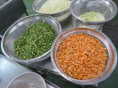 ビビンバは、ごはんの上に、野菜の和え物や味付けした肉、卵などをのせて、ごま油とコチュジャンを加えてよく混ぜて食べます。今日は、それぞれの具を作ってごはんとよく混ぜた、「まぜまぜビビンバ」にしました。コチュジャンで甘めの味にした豚ひき肉とぜんまいと、少ししょっぱい味にした野菜のナムルが混ざり合って、ちょうど良い味に仕上がりました。子供たちも、あっという間に食べてしまっていました。