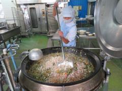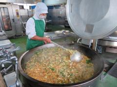 枝豆は、市内の農家さんに持ってきていただきました。15kgの枝豆のさやから一粒一粒豆を出すのは大変でしたが、つやがあって味の濃い豆をたくさん入れることができました。枝豆は、別でゆでて炊いたごはんに混ぜました。彩りもきれいで、とてもおいしかったです!
