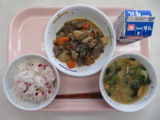 カリカリ梅ごはん 筑前煮 たまねぎとキャベツのみそ汁 牛乳