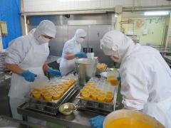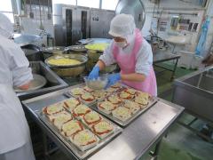 焼きそばは、ソースの味と良い香りでお祭りの屋台等でも人気の料理です。給食のように一度に大量に作ると、野菜から出る水分等でべちゃっとした仕上がりになりやすいので、野菜は一度さっとゆでてから炒め、麺はオーブンでカリッと焼いています。給食なので味は薄めにしていますが、ソース感はしっかり感じられるおいしい味に仕上げることができました。
