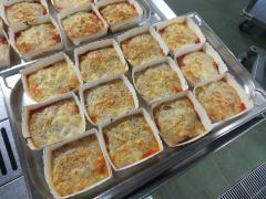 今月の世界の料理給食は、「ギリシャ」の料理です。もうすぐ、東京オリンピック・パラリンピックが行われるので、今日はオリンピック発祥の地であるギリシャの料理を作ってみました。「ムサカ」は、なす、じゃがいも、ミートソース、ホワイトソースを重ねてオーブンで焼いた、ギリシャの代表的な料理です。何層にも重ねていくので手間がかかって大変ですが、なすが苦手な子もおいしく食べてくれたようなので嬉しかったです。「レヴィシアスーパ」のレヴィシアはひよこ豆、スーパはスープのことで、ひよこ豆が入ったスープです。今日のパンは、オリンピックで優勝した選手に贈られる冠をイメージして、パン屋さんに作ってもらいました。明日葉を練り込んでいるので、葉っぱのようにきれいな緑色になっていました。オリンピック・パラリンピックのことも考えながら、おいしくいただきました。