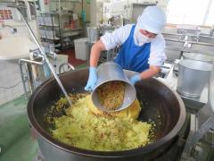 今月の世界の料理給食は、「インド」の料理です。インドでは、ターメリックやクミン、コショウなど、色々なスパイスを使って料理を作るので、給食でもスパイスをたくさん使ってみました。ビリヤニは、インドの炊き込みごはんです。給食ではごはんを炊いて、後から味付けした具材を混ぜました。サモサは、ゆでてつぶしたじゃがいもを包んで揚げた料理で、屋台などで売られ、日常的によく食べられています。コリアンダー、クミン、ターメリック、レッドペッパーを入れましたが、結局カレーのような味になりました。スープには、インドでカレーによく使われているレンズ豆を入れました。今日は特にサモサが人気で、みんなおいしそうに食べていました。