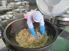 もち米は、具材と一緒に味付けして、7分炊きくらいまで加熱します。