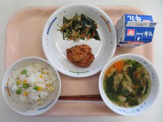 コーンピースごはん 鶏のから揚げ 海藻の和え物 五目汁 牛乳