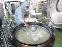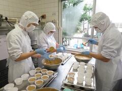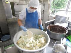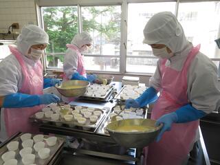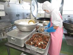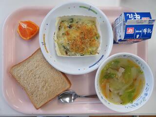 今日はどの料理も人気があり、残食がとても少なかったです。グラタンには、昨年度に使いきれなかった防災用備蓄米のアルファ化米を使いました。いつもはじゃがいもやマカロニで作るグラタンをアルファ化米にして作ってみましたが、大人気でした。ホワイトソースに混ぜることで、ボソボソ感もなくおいしく食べられました。