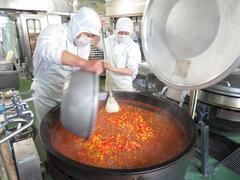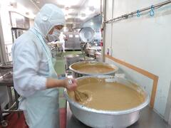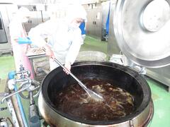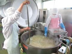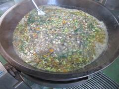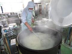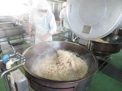 具材を炒め、だし汁、調味料、もち米を加え、7分炊きくらいまで強火で加熱します。