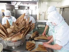 かつおは海を北に行ったり南に行ったりする魚なので、年に2回旬があります。1回目は3月から5月頃で、三陸海岸方面にえさを求めて上っていくもので、「初がつお」と呼ばれます。2回目は9月から10月頃で、産卵のために下ってくるもので、「戻りがつお」と呼ばれます。戻りがつおはえさをたくさん食べて脂がのっているのに対し、初がつおはさっぱりしています。初がつおはその年初めてとれるものなので、これを食べると縁起が良いと言われて江戸時代から大事にされています。今日は、初がつおを竜田揚げにしました。「かつお」だということをお手紙でも伝えたのですが、お肉だと思って食べている子も多かったようです。