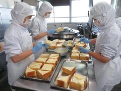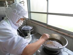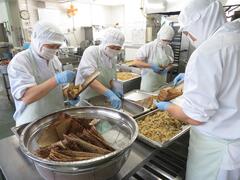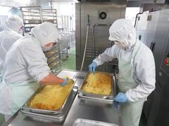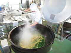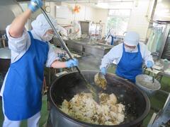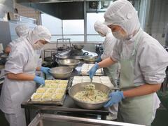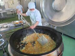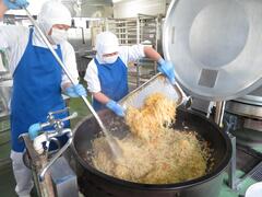 焼きそばは、蒸した中華麺を、豚肉、キャベツ、にんじん、たまねぎ、もやしなどの具材と一緒に炒めて作ります。給食では、蒸した中華麺をさらにオーブンでカリッと焼いてから具材に合わせています。こうすることで、大量の野菜から出た水分を吸っても麺がべちゃっとなりにくく、香ばしさも出てよりおいしく食べられます。給食の焼きそばが初めての1年生からも、「焼きそばがおいしかった!」「焼きそばは全部食べた!」と大好評でした。