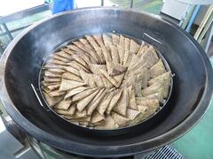 酒、しょうゆ、しょうがにかつおをしっかりと漬け込んでから、かたくり粉と上新粉をまぶして揚げます。