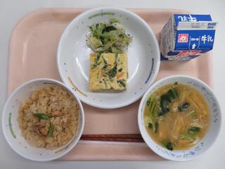 豆ごはん 千草焼き ゆかり和え えのきと大根のみそ汁 牛乳