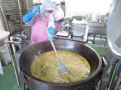 今日のカレーライスは、いつものと少し違って、春野菜がたくさん入ったカレーライスです。食べ物には「旬」があります。現在は、栽培技術の向上や品種改良、海外からの輸入などによって、一年中お店に並ぶものがたくさんありますが、旬の食べ物は、おいしくて栄養がたっぷりな上、値段も安いです。旬の時期は、その年の天候や品種、栽培地域によっても変わりますが、今日は一般的に春が旬の「じゃがいも、たまねぎ、キャベツ、アスパラガス」を使いました。数日前にアスパラのサラダを提供した時に、「アスパラが苦手だから食べられない。」と言っていたのに、「カレーおいしかった!」ときれいに完食してくれている子がたくさんいたのが嬉しいです!今年度は、夏野菜、秋野菜、冬野菜のカレーも作っていければと思っています。