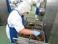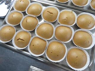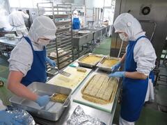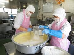 今日は黒砂糖を使った蒸しパンです。砂糖には、上白糖、三温糖、グラニュー糖、黒砂糖など色々な種類があり、使い分けることで料理がよりおいしくなります。黒砂糖は、さとうきびのしぼり汁をそのまま煮詰めて固めた、色の黒い砂糖です。濃厚なあまさと強い風味があり、かりんとうやふ菓子など、お菓子作りによく使われます。蒸しパンにもよく合っていて、素朴なやさしい味に仕上がり、おいしかったです。ボリュームがあったのでお腹いっぱいという子も多かったですが、おいしかったと好評でした。