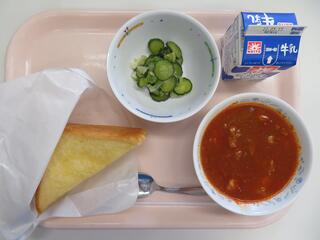 今日は世界の料理給食で、「ハンガリー」の料理です。ハンガリー料理の一番の特徴は、パプリカをたくさん使うことです。生のパプリカだけでなく、乾燥させて粉にして香辛料としても使います。今日の給食の「グヤーシュ」も、パプリカを使って作るシチューのような料理で、ハンガリーの代表的な家庭料理です。「シャラータ」は、ハンガリーのサラダのことです。ハンガリー料理ではクミンという香辛料もよく使われるので、ドレッシングにはクミンを入れました。また、ハンガリーははちみつも有名で、パンにぬって食べることも多いので、パンは「はちみつレモントースト」にしました。一番人気ははちみつレモントーストでしたが、今日はどの料理も残食が少なかったです。