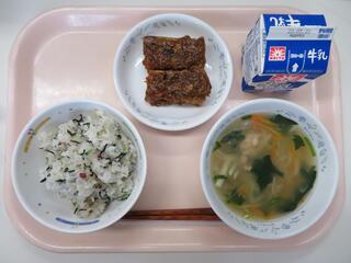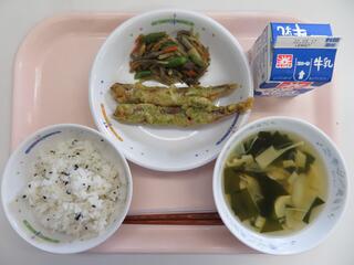 ごま塩ごはん ししゃもの磯辺揚げ じゃがいものきんぴら 若竹汁 牛乳