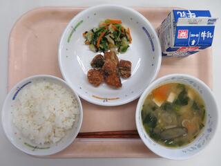 ごはん かつおの竜田揚げ 野菜の昆布和え みそけんちん汁 牛乳