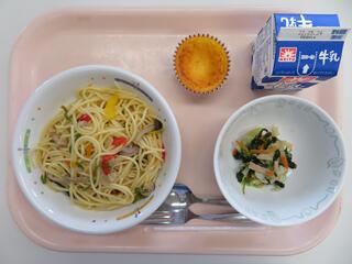 オリエンタルスパゲティ ほうれん草のサラダ オレンジスフレ 牛乳