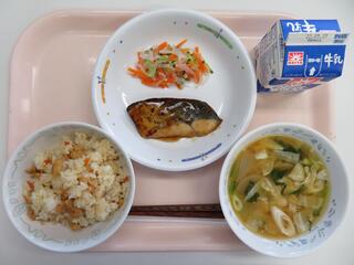 小ぎつねごはん さわらの照り焼き 三色なます 春キャベツのみそ汁 牛乳