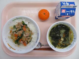 スタミナ丼 あさりとわかめのスープ 冷凍みかん 牛乳