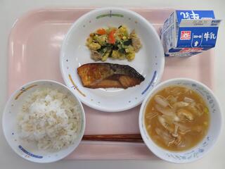 ごはん さばの辛味焼き 卵と野菜の炒め物 新たまねぎのみそ汁 牛乳